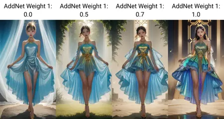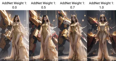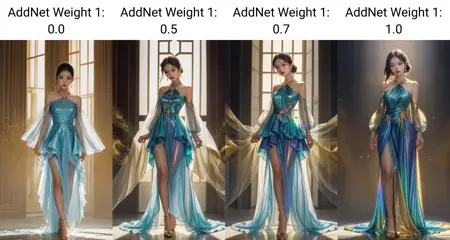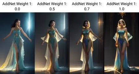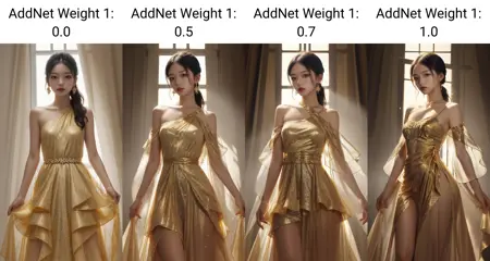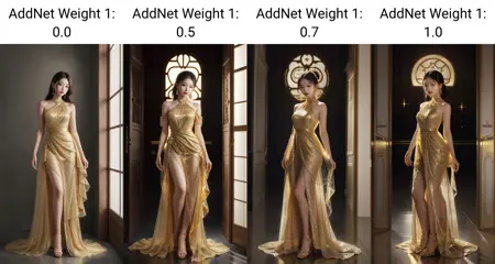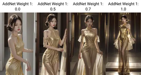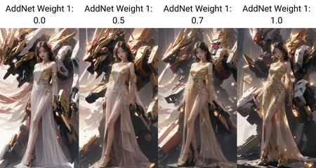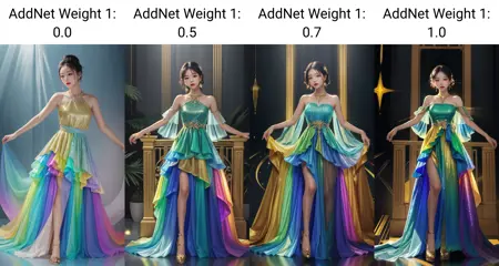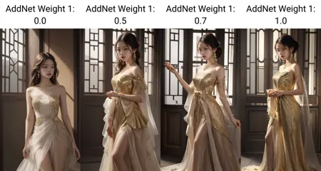 이 LoRA는 주로 의상의 실루엣과 질감, 착용된 액세서리에 영향을 미치며, 배경에는 일부 궁전적 요소가 나타나고, 조명 효과가 강화되어 윤곽광이 더 뚜렷해집니다. 얼굴과 동작에는 거의 영향을 주지 않습니다.