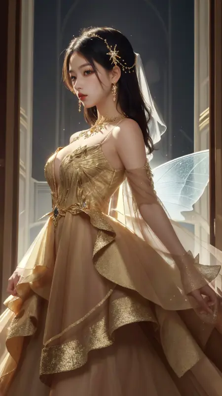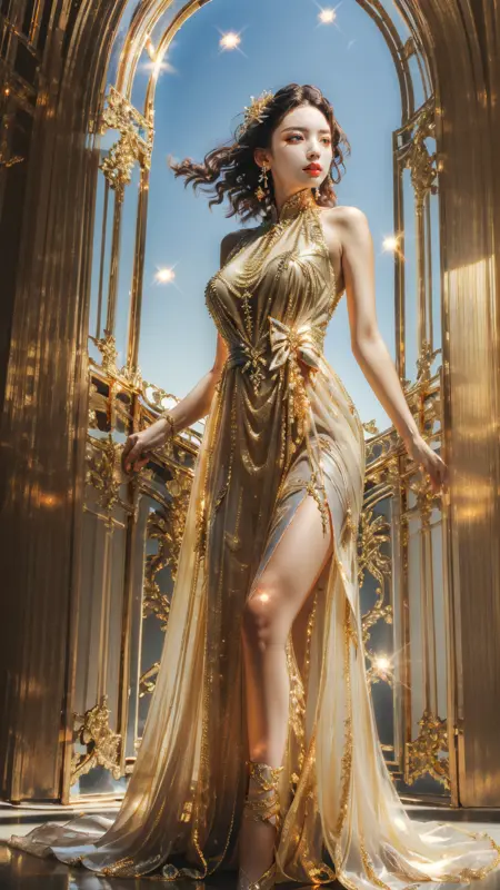 영감 출처: 황금빛 요정 드레스를 상상해보세요. 다층으로 세련된 커팅과 반짝이는 질감을 지닌 드레스 말입니다.