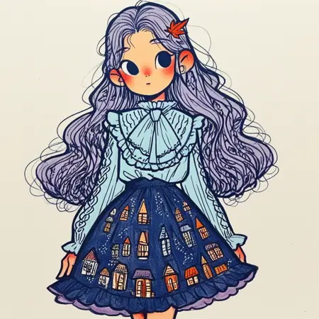 기이한 헤어스타일과 디테일: 머리카락에는 종종 무늬, 별, 작은 집, 나비, 혹은 완전한 풍경이 숨겨져 있습니다.