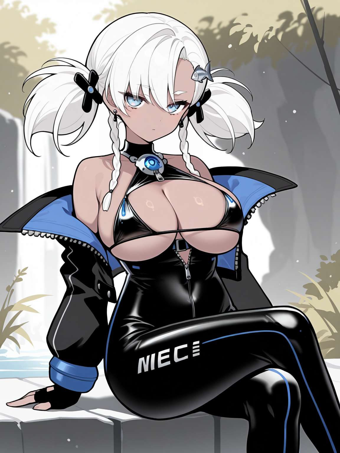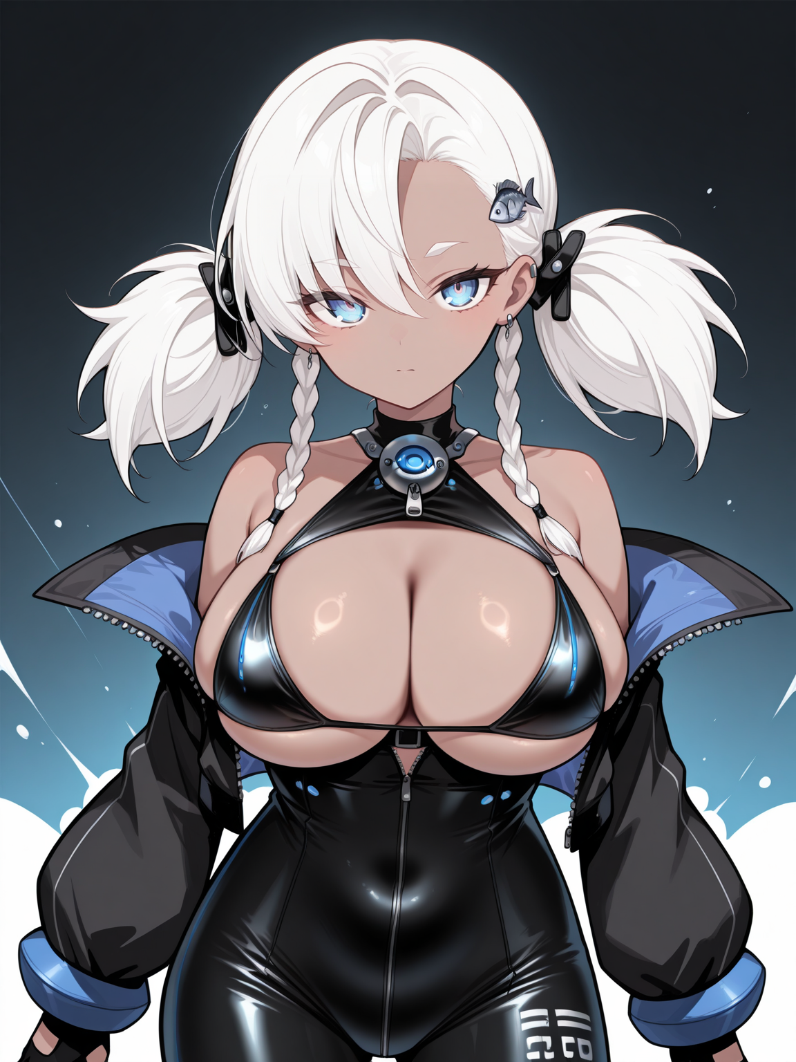 服装:ブラックのボディスーツ、ブラックのビキニトップ、マイクロビキニ、アンダーブーブ、胸元、部分的にジッパーが開いている、ジッパー、裸の肩、ブラックのジャケット、開いたジャケット、短めのジャケット、ブラックのカラー、青いチョーカー、ブラックのグローブ、指なしグローブ、肌にぴったり、ラテックス、光沢のある服