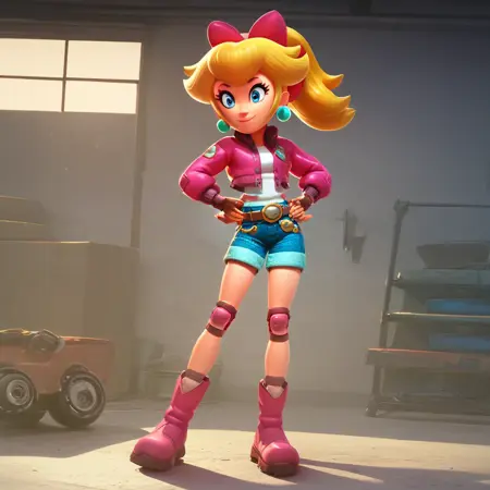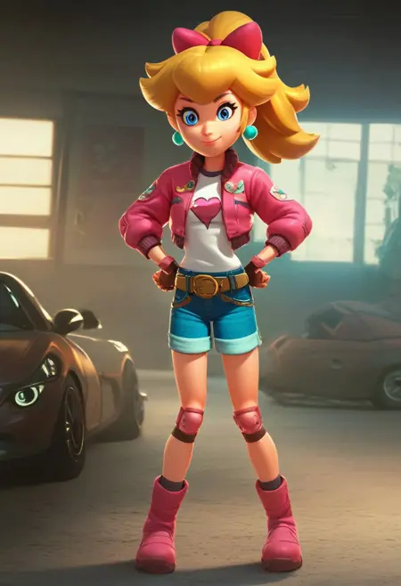 タグ:「BC_P3ach、ブロンドの髪、青い目、イヤリング、ポニーテール、ピンクの髪飾り、ピンクのジャケット、開いたジャケット、白いTシャツ、指なしグローブ、デニムのショートショーツ、ベルト、膝当て、ピンクのブーツ」
