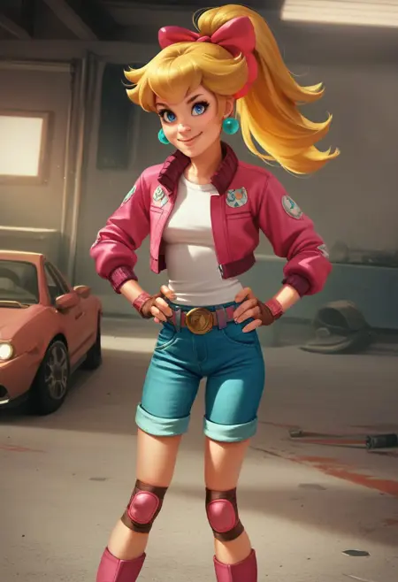 태그: "BC_P3ach, 금발, 파란 눈, 귀걸이, 단발, 분홍색 헤어 리본, 분홍색 자켓, 벌어진 자켓, 흰색 티셔츠, 손가락 없는 장갑, 청바지 단축바지, 벨트, 무릎 패드, 분홍색 부츠"