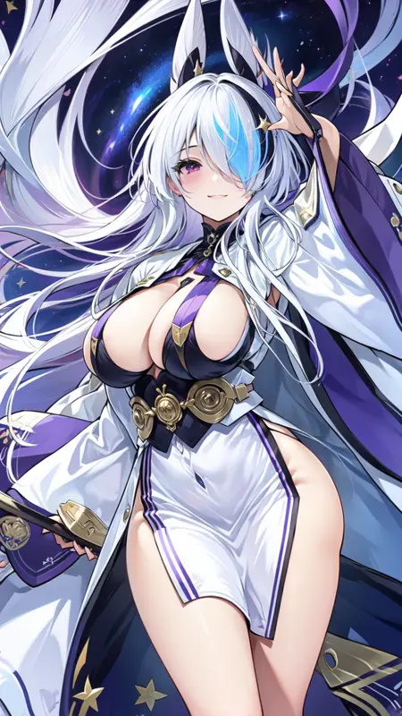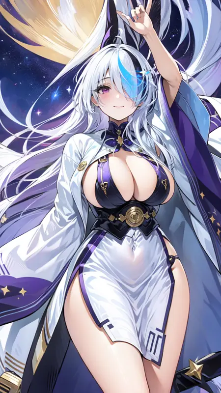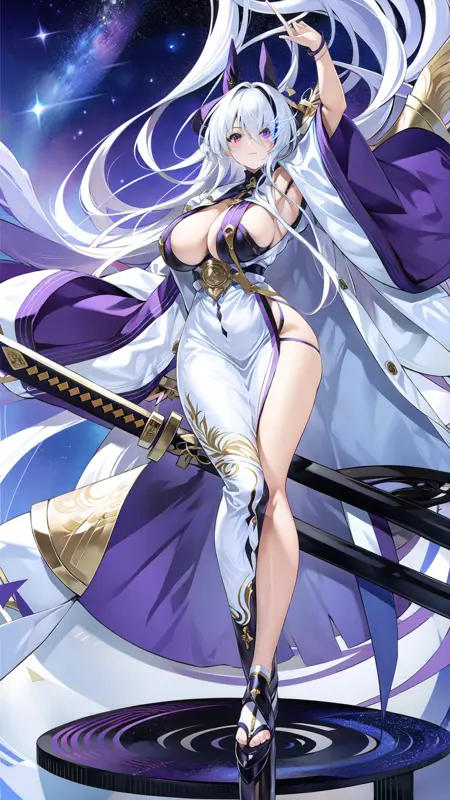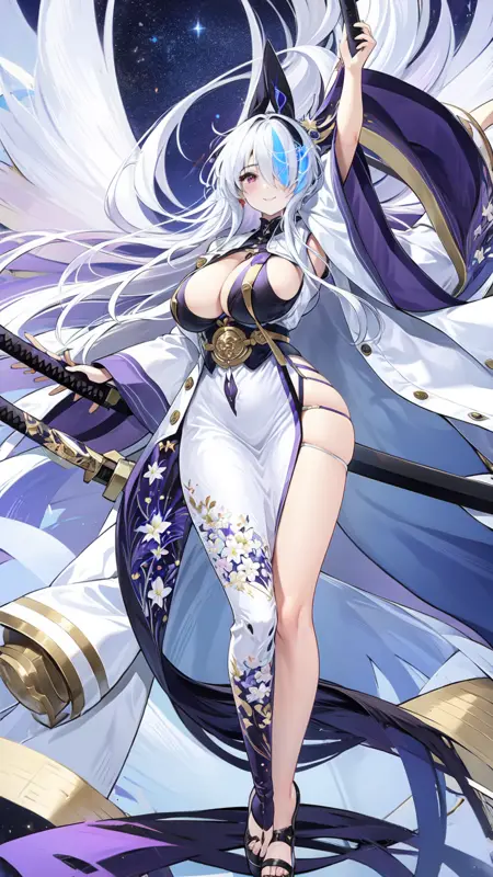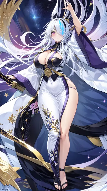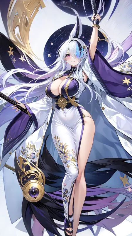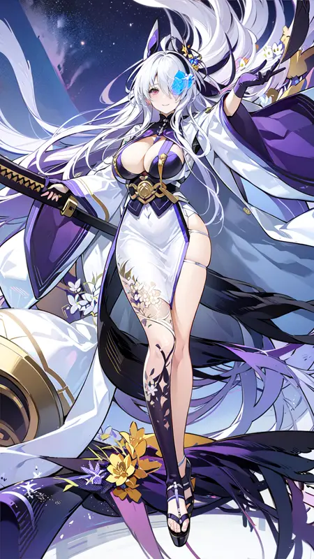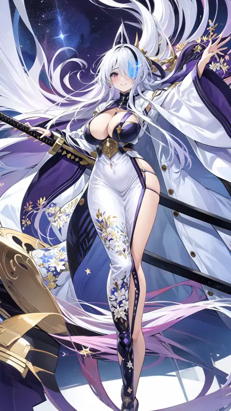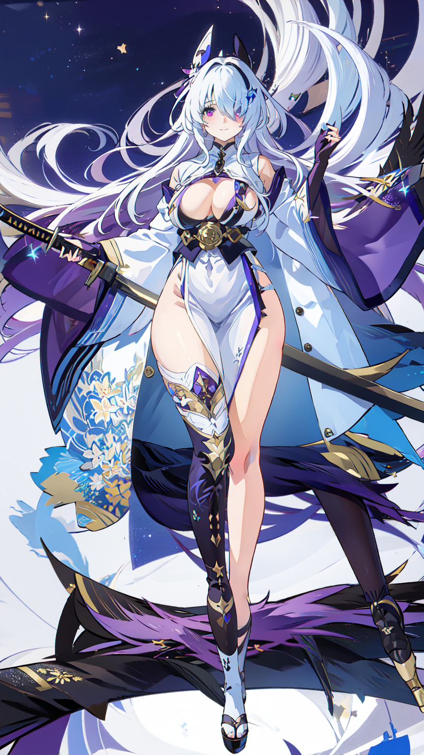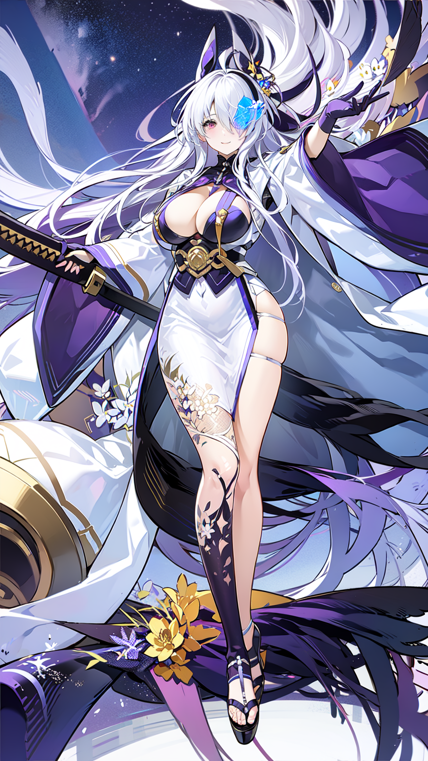 1girl, sword, katana, weapon, breasts, long hair, sheath, solo, zoom layer, looking at viewer, purple eyes, unsheathing, large breasts, holding, wide sleeves, japanese clothes, holding sword, full body, hair ornament, cleavage, thighs, white dress, mole, long sleeves, very long hair, gloves, white hair, bangs, sheathed, black footwear, coatfull body, night sky, dark, stars, starry sky, milky way, lights, light particles, fairy, standing, lora:ijnUnzenV1-000008:0.8, ijnunzen, one eye covered, smile, blushed