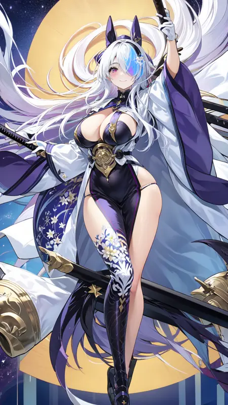 -->プロンプト:ijnunzen, one eye covered, sheath, unsheathing, wide sleeves, japanese clothes, hair ornament, cleavage, thighs, white dress, mole, long sleeves, gloves, white hair, bangs, black footwear, coatfull body,