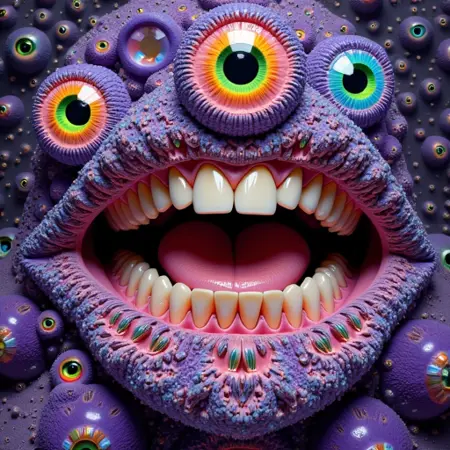 这只是我想出的一个奇怪的概念,我从各种列表中加入了大量随机内容——比如数学方程、密铺图案、微生物、矿物/元素等等……还告诉它大量的人类眼睛和一排排的人类牙齿。然后我用这些图像在OpenArt上创建了一个模型,并用这些图像制作了这里的东西。另外,我其实也不太清楚自己在干嘛,抱歉。
