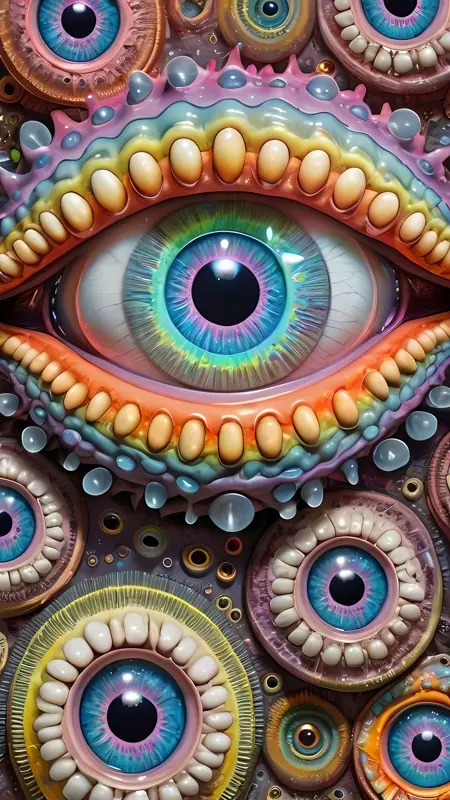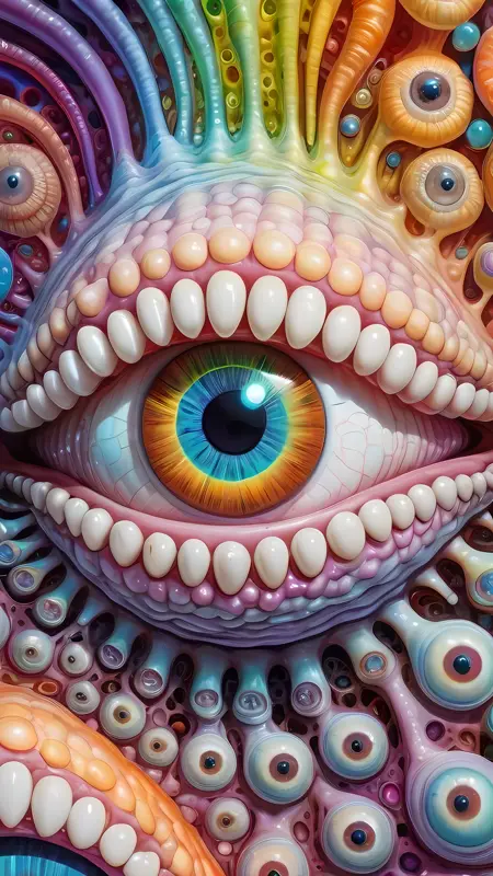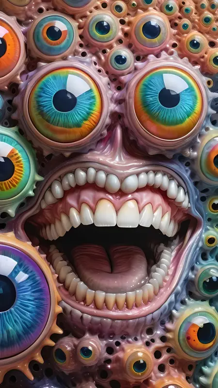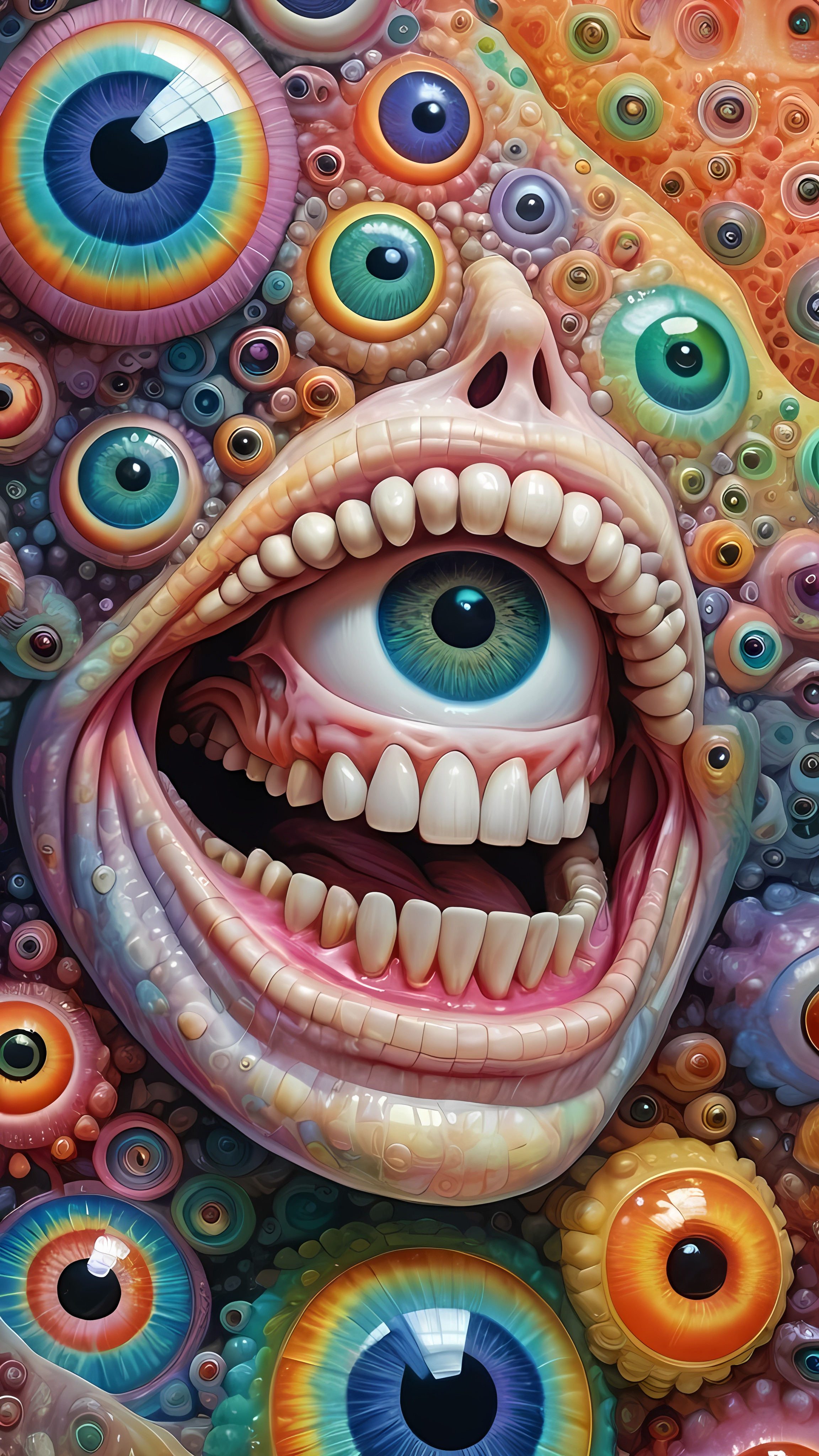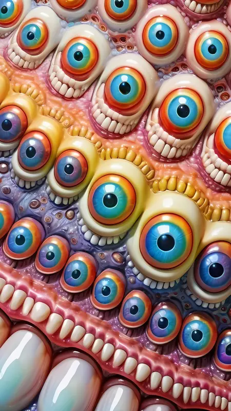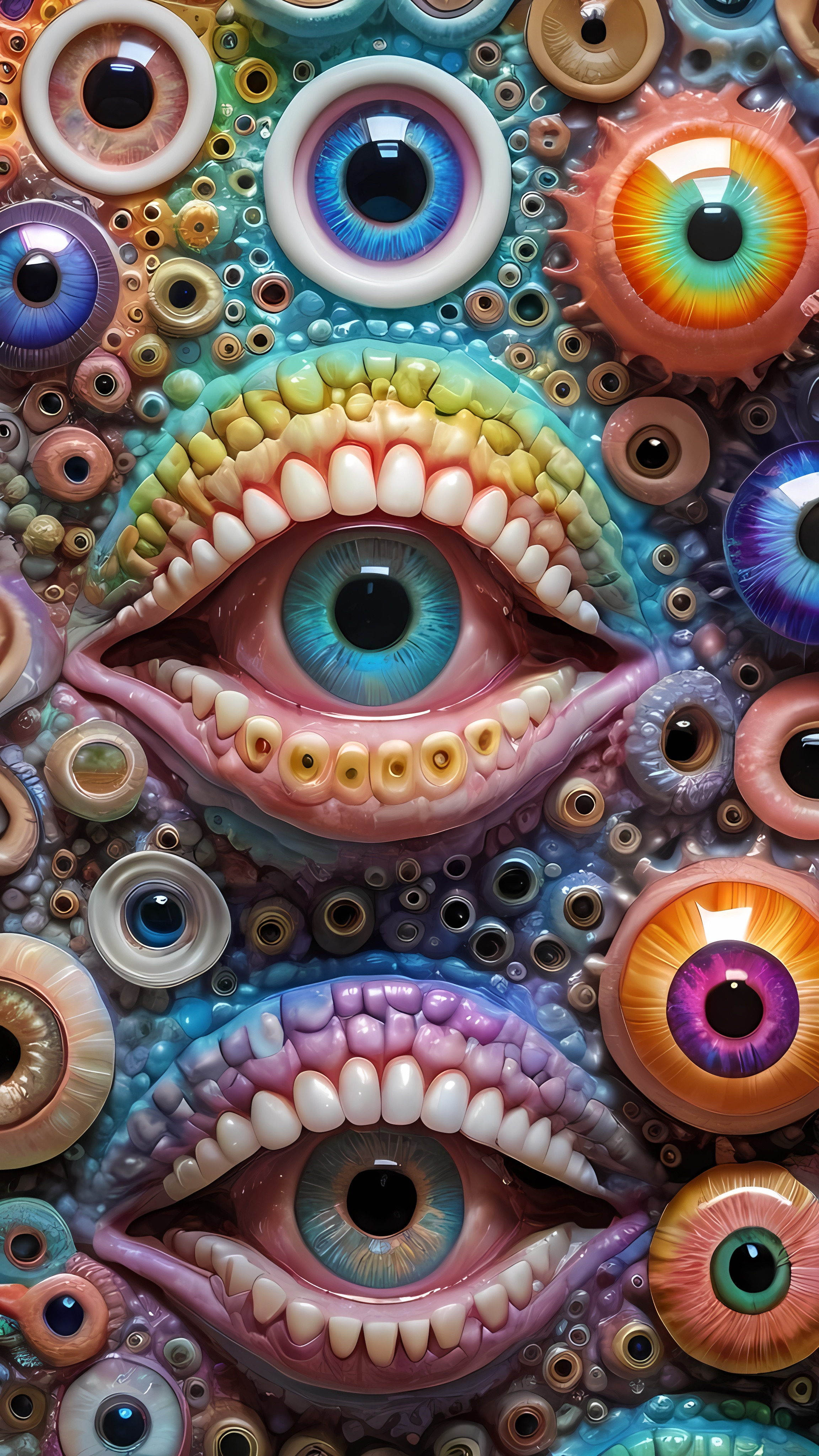 just a weird concept i came up with, i plug in lots of random stuff from lists of like - math equations, tiling patterns, microorganisms, minerals/elements… and more… & told it lots and lots of human eyes and rows upon rows of human teeth. then i used those images to make a model on open art and i used THOSE images to make this thing here. also i kinda have no clue what im doing sorry about that