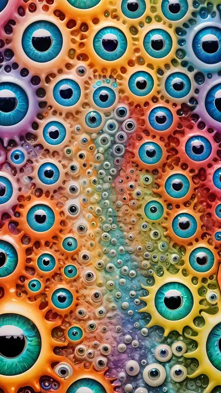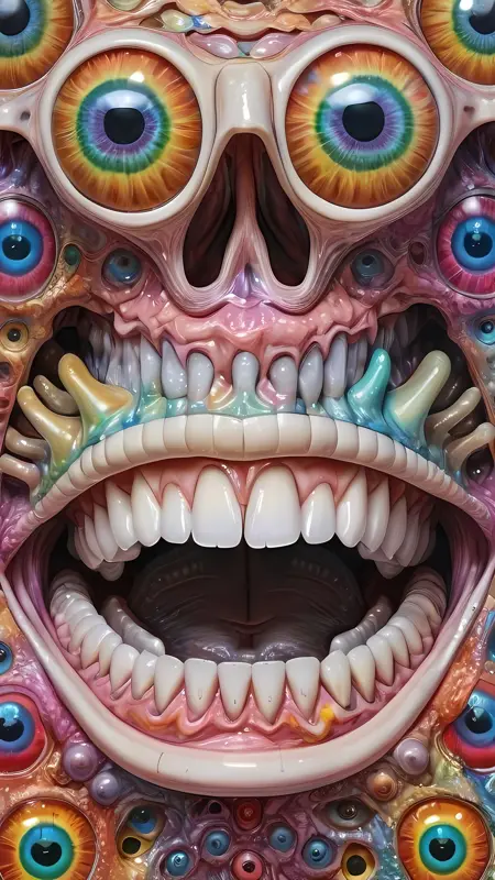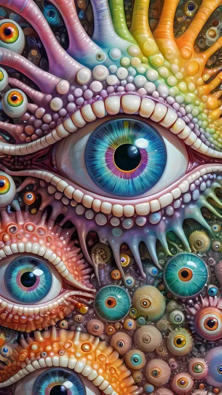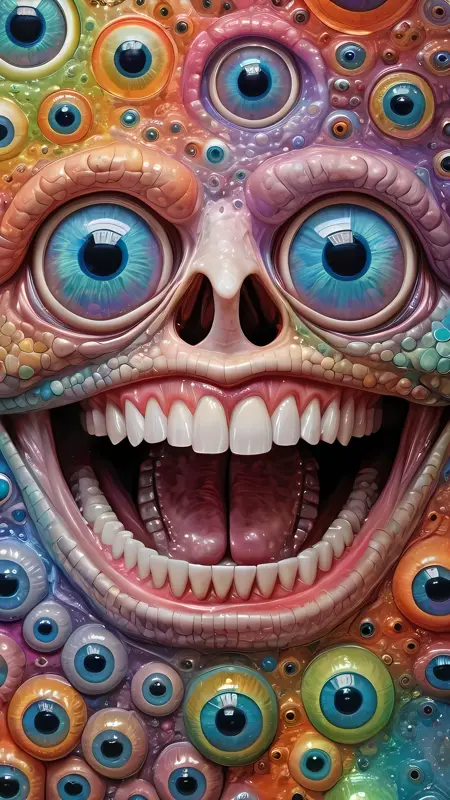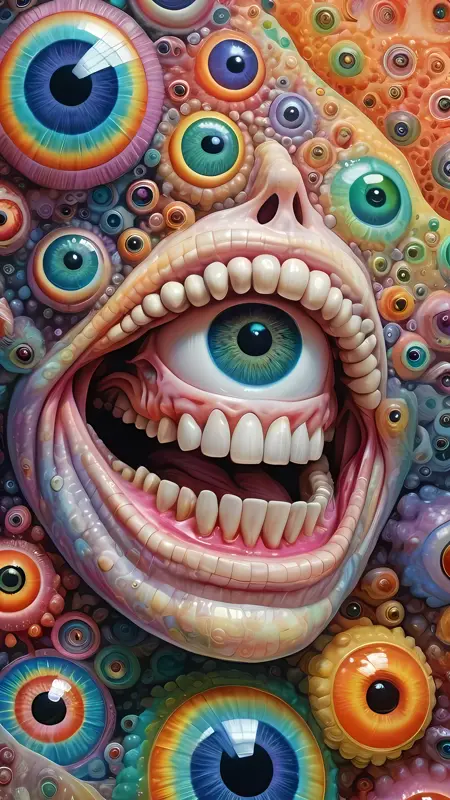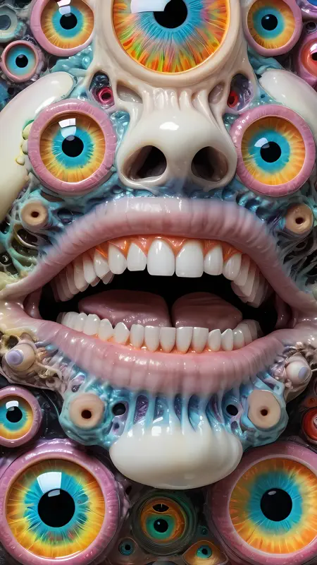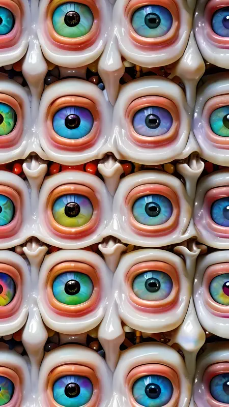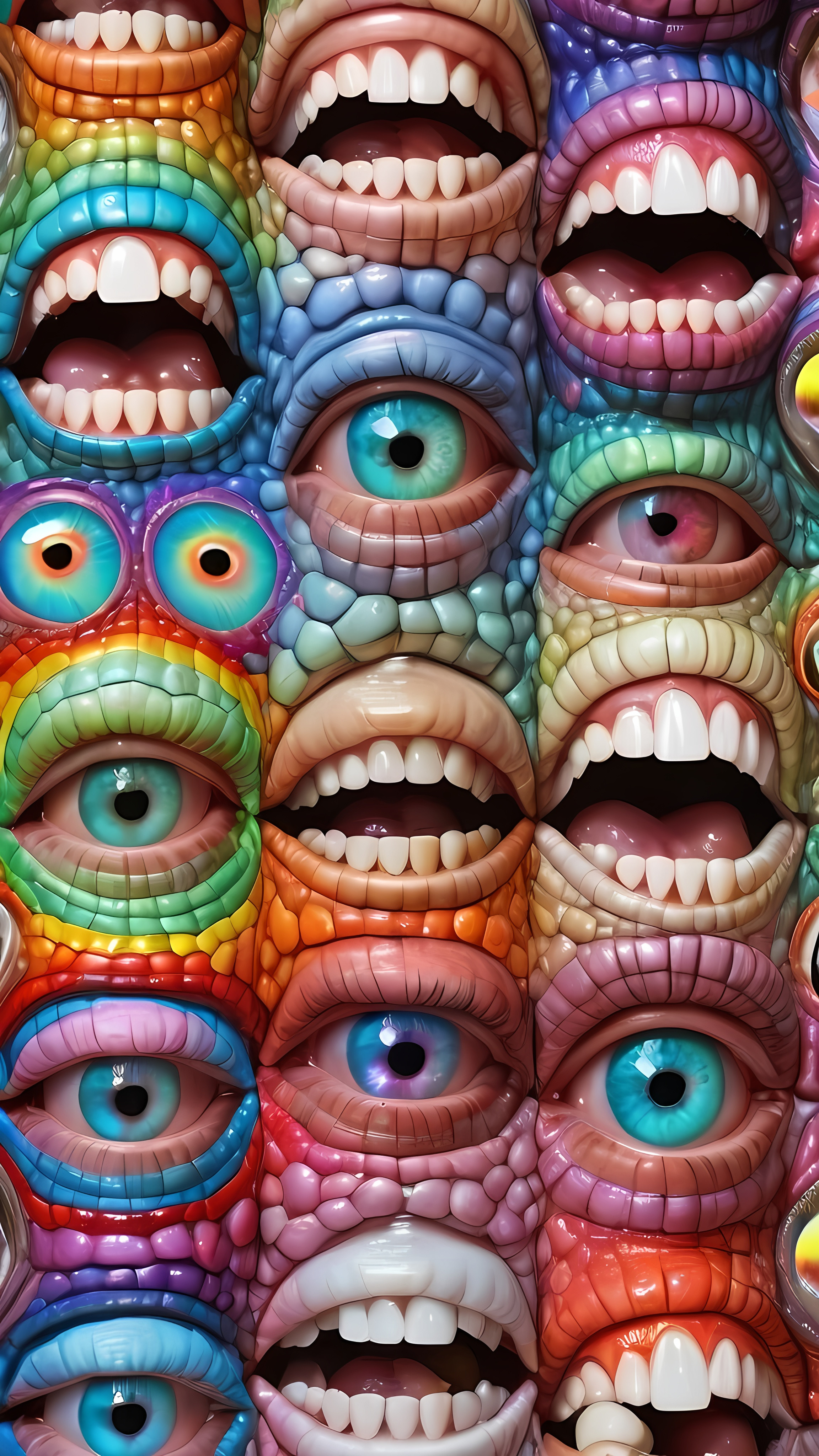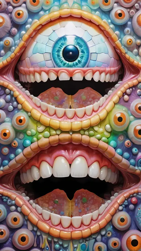 just a weird concept i came up with, i plug in lots of random stuff from lists of like - math equations, tiling patterns, microorganisms, minerals/elements… and more… & told it lots and lots of human eyes and rows upon rows of human teeth. then i used those images to make a model on open art and i used THOSE images to make this thing here. also i kinda have no clue what im doing sorry about that