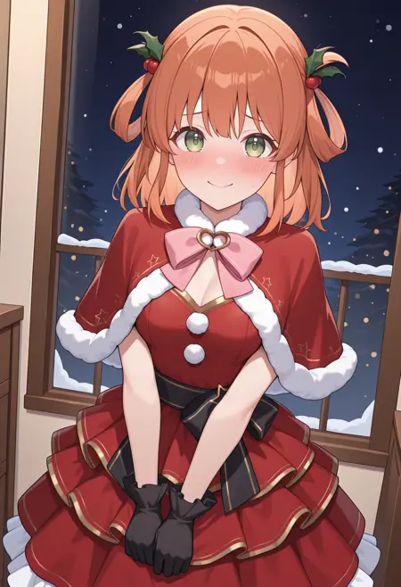 - rinomas, ヘアオーナメント, ヘアフロワー, 桜のヘアオーナメント, ファートリムカープレット, 赤いカープレット, 赤いドレス, ピンクのボウタイ, ウエストリボン, 黒いボウ, フリル付きドレス, サンタコスチューム, レイヤードドレス, 黒い手袋,