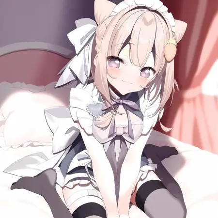 maid headdress,white bow,black thighhighs,apron,thigh strap,frills,
