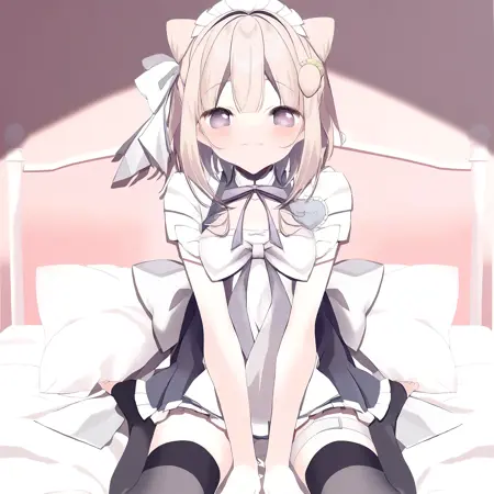 maid headdress,white bow,black thighhighs,apron,thigh strap,frills,