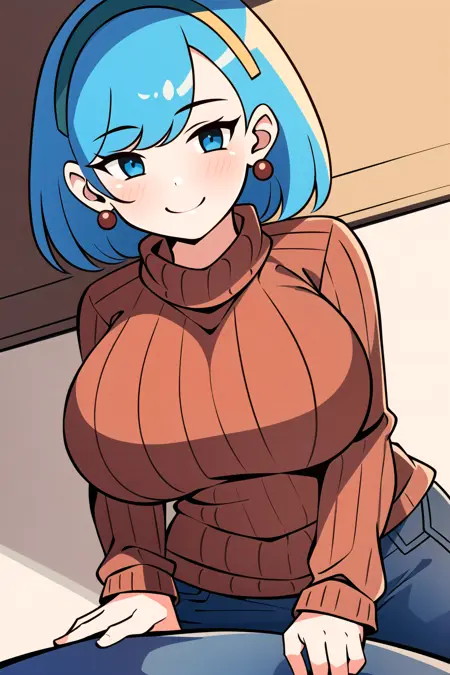 앞머리, 파란 눈, 파란 머리카락, 헤어밴드, 모브 얼굴, 주황색 스웨터, 빨간 귀걸이, 단발머리