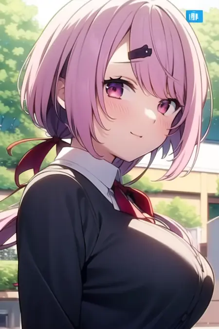 sample prompt: lora:shiinayuika:0.9, shiina yuika, long hair, low ponytail, pink and white hair, multicolored hair, red eyes, hair clip, huge breasts, tareme,