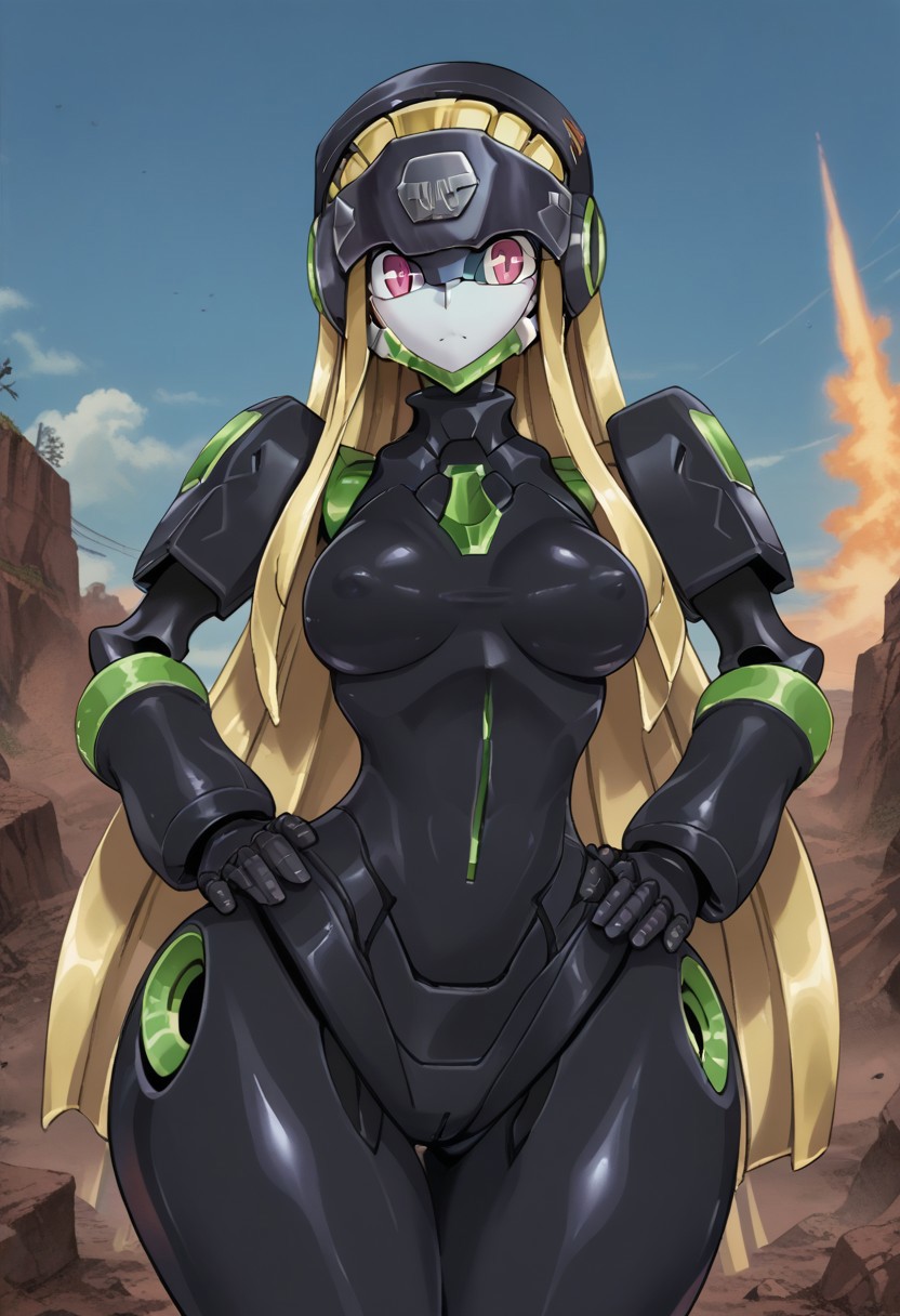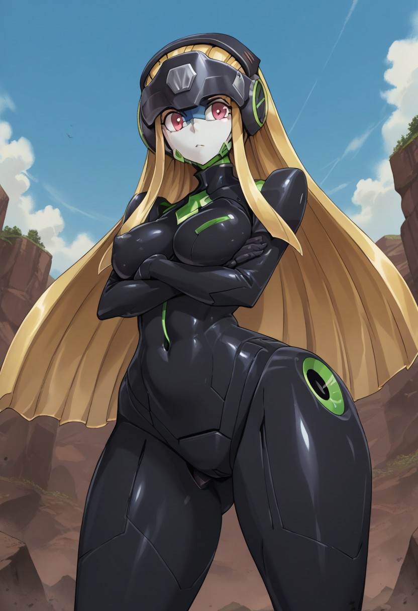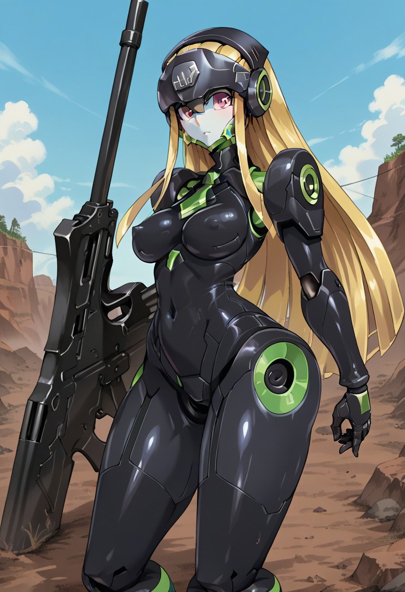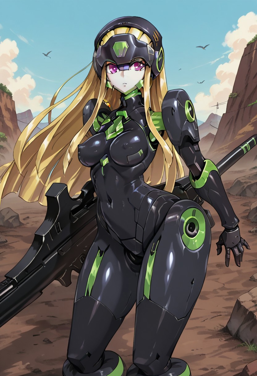 GenistaLA, 1girl, solo, breasts, blonde hair, robot, bodysuit, black bodysuit, long hair, medium breasts, colored skin, black skin, multicolored skin, white skin, purple eyes, android, robot ears, joints, mecha musume, robot girl,