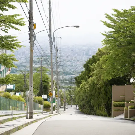 haruhizaka, kitakoumae, scenery, outdoors, road, power lines, city, tree, building, cityscape, road sign, utility pole, street, sky, day, real world location, realistic,