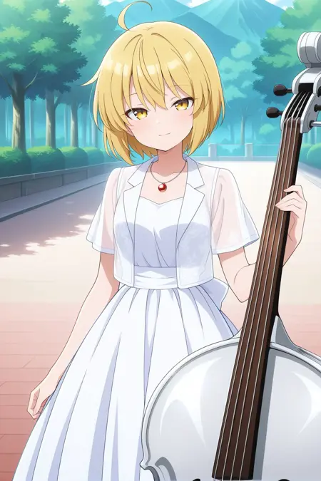 lunasa prismriver, 1girl, solo, yellow eyes, blonde hair, short hair, lunasa prismriver \(white double bassist\), ahoge, alternate costume, white vest, short sleeves, see-through vest, wedding dress, necklace, white dress, white double bass,