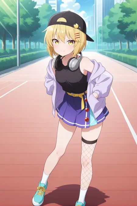 lunasa prismriver, 1girl, solo, yellow eyes, blonde hair, short hair, lunasa prismriver \(eldest memory leaker sister\), alternate costume, baseball cap, black hat, backwards hat, grey headphones, headphones around neck, hairclip, purple hoodie, open hoodie, long sleeves, bare shoulders, black shirt, yellow belt, multicolored skirt, purple skirt, blue skirt, asymmetrical legwear, fishnet thighhighs, single thighhigh, single sock, white socks, aqua shoes,