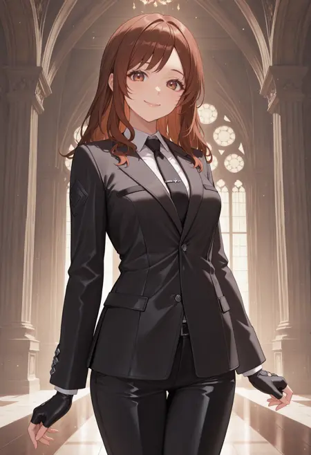 cssdf,棕眼睛,棕头发,长发,波浪发,黑色领结,西装,黑色夹克,白衬衫,黑裤子,黑色手套,露指手套