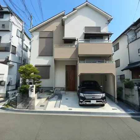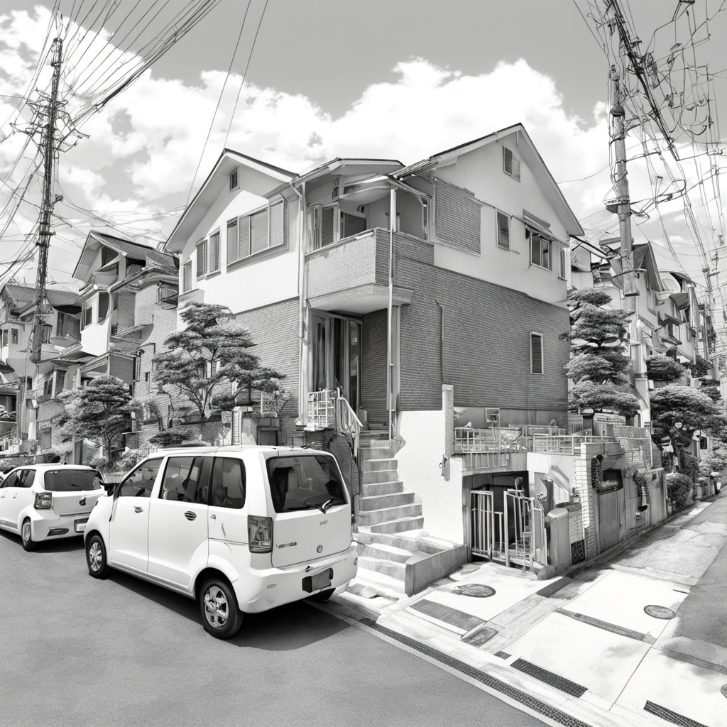 jyutaku, japan, scenery, car, ground vehicle, motor vehicle, outdoors, tree, scenery, sky, building, window, vehicle focus, day, real world location, power lines, blue sky, utility pole, lamppost, road, house, realistic, toyota