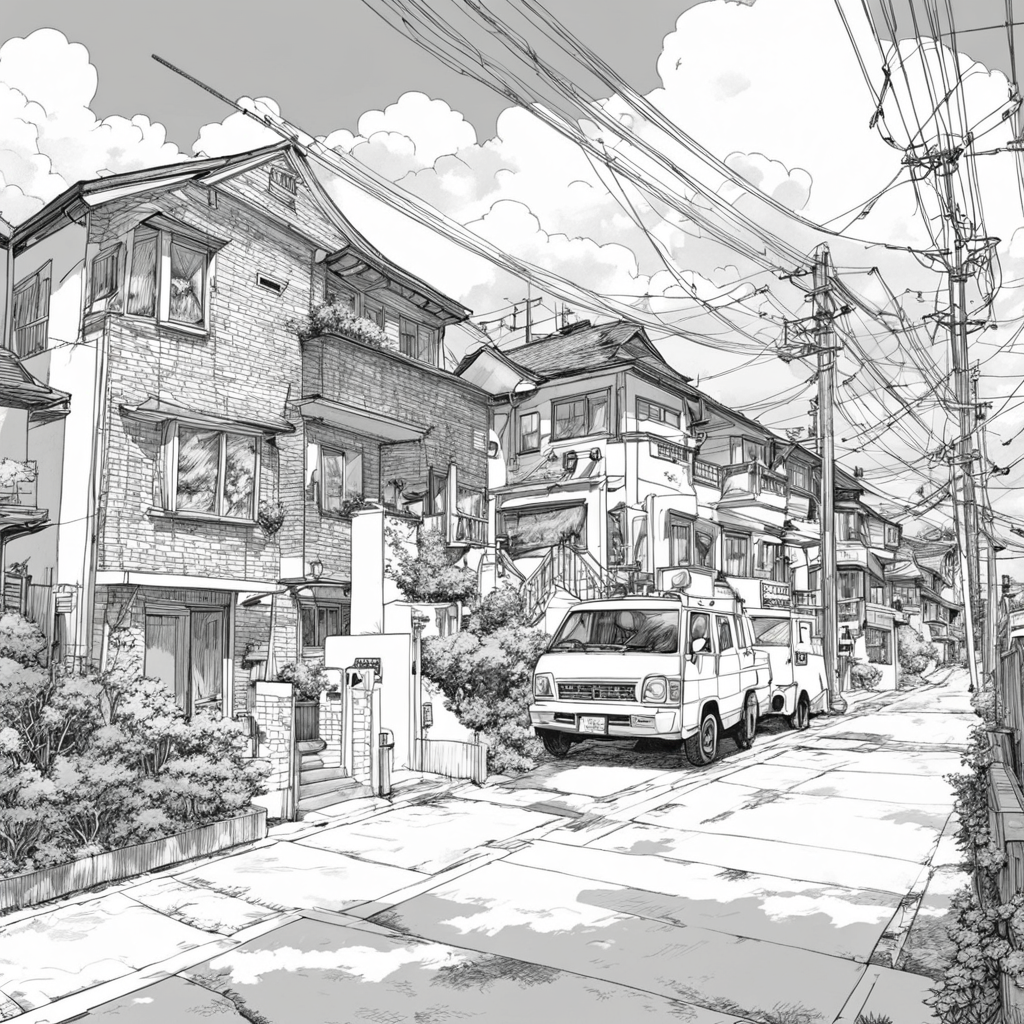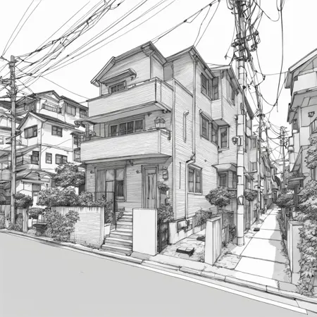 jyutaku, japan, scenery, outdoors, sky, power lines, building, road, window, street, utility pole, blue sky, day, house, fence, city, lamppost, cityscape, realistic,