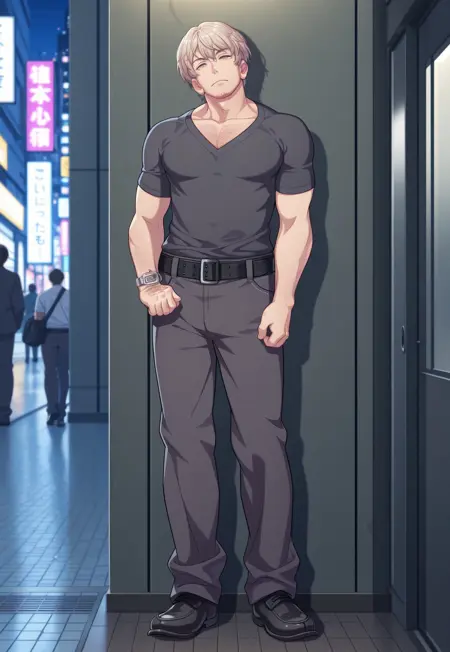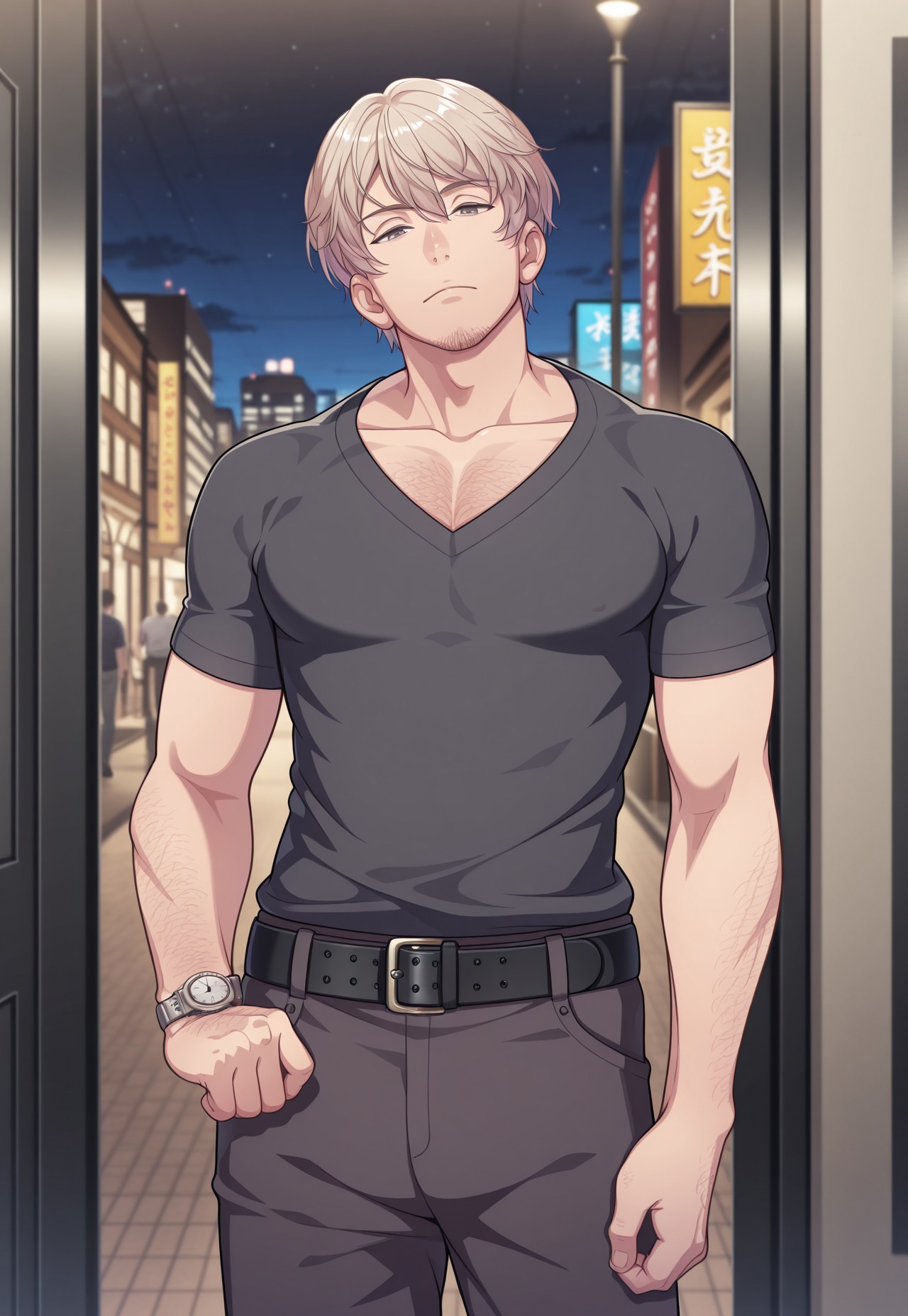 デフォルト:Maki、薄い金髪、薄い灰色の目、ヒゲ、VネックTシャツ、胸のくびれ、胸毛、毛深い前腕、薄い灰色の腕時計、穴の開いた黒いベルト、濃い灰色の破れたズボン、黒い靴