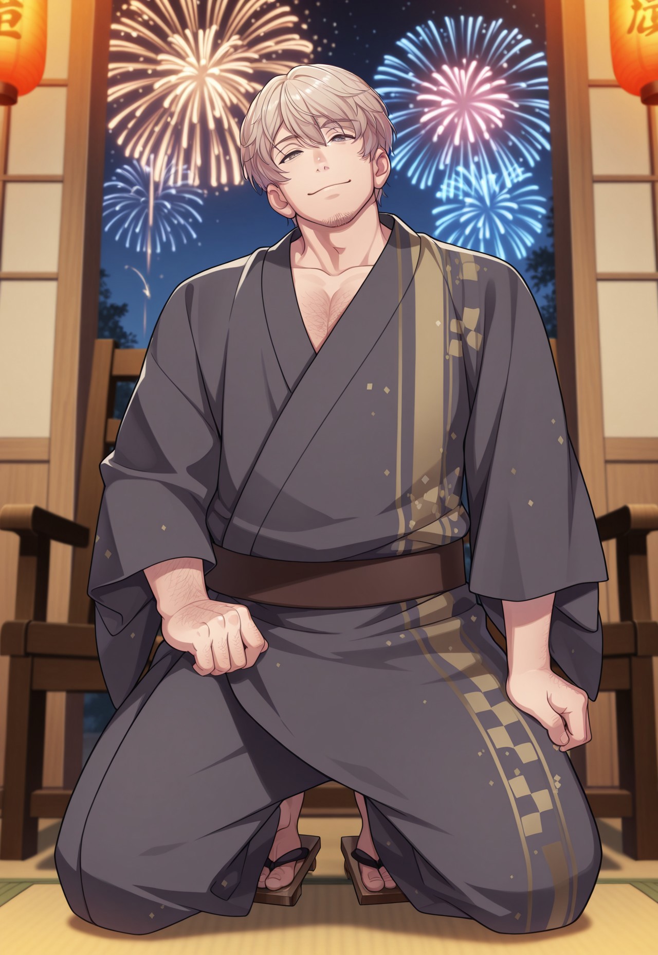 着物:Maki、Makimono、薄い金髪、薄い灰色の目、ヒゲ、胸のくびれ、胸毛、濃い灰色の着物、着物に黄色い中国風模様、毛深い前腕、茶色の帯、下駄