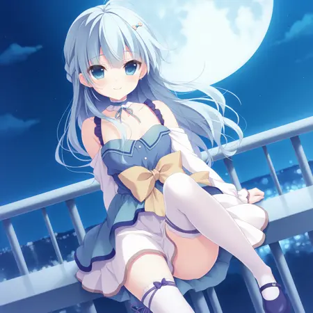 two side up,hair bow,purple hairband,casual,detached sleeves,waist bow,yellow bow,blue dress,white dress,layered dress,white skirt,brown trim,off-shoulder dress,frilled straps,white sleeves,long sleeves,detached collar,white collar,blue ribbon,blue choker,ribbon choker,frilled dress,purple trim,purple frills,purple straps,frilled sleeves,sleeve bow,bow legwear,white thighhighs,thigh ribbon,purple ribbon,