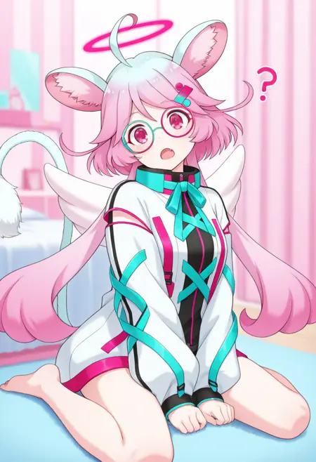光环、粉红色眼睛、眼镜、呆毛、多色头发、低双马尾、蓝色头发、粉色头发、渐变色头发、动物耳朵、尾巴、发饰、翅膀、虎牙
