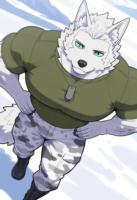 복장 프롬프트: "흰색 캠oufl라지 재킷, 녹색 셔츠, 조이는, 개 목걸이, 흰색 캠oufl라지 바지, 검은 부츠, 검은 박서 브리프"