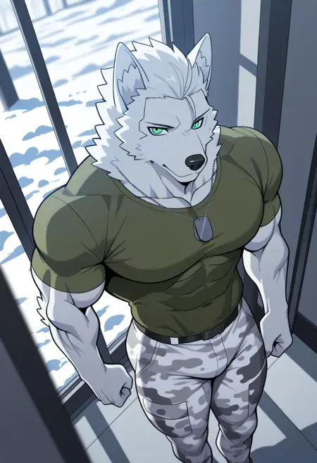 강화 프롬프트: "늑대 소년, 퓨리, 꼬리, 청록색 눈, 근육질, 성숙한 남성, 바라, 통통한, 큰 흉근"