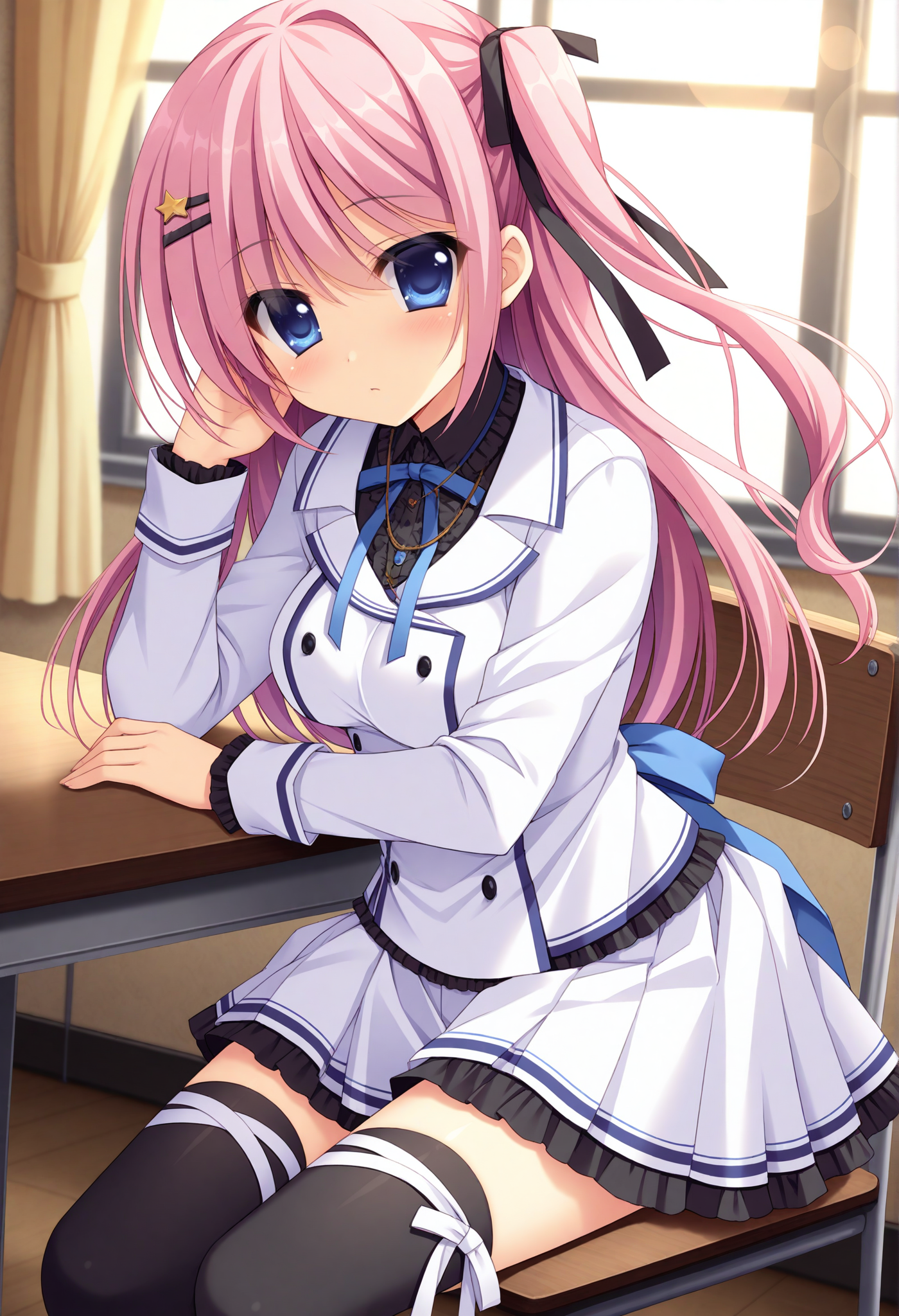 one side up,star hair ornament,parallel hairclips,hair ribbon,black ribbon,school uniform,black thighhighs,long sleeves,black shirt,collared shirt,neck ribbon,blue ribbon,back ribbon,white jacket,collared jacket,center frills,black frills,double-breasted,frilled shirt,white sleeve cuffs,purple trim,miniskirt,frilled skirt,pleated skirt,white skirt,thigh ribbon,white ribbon,