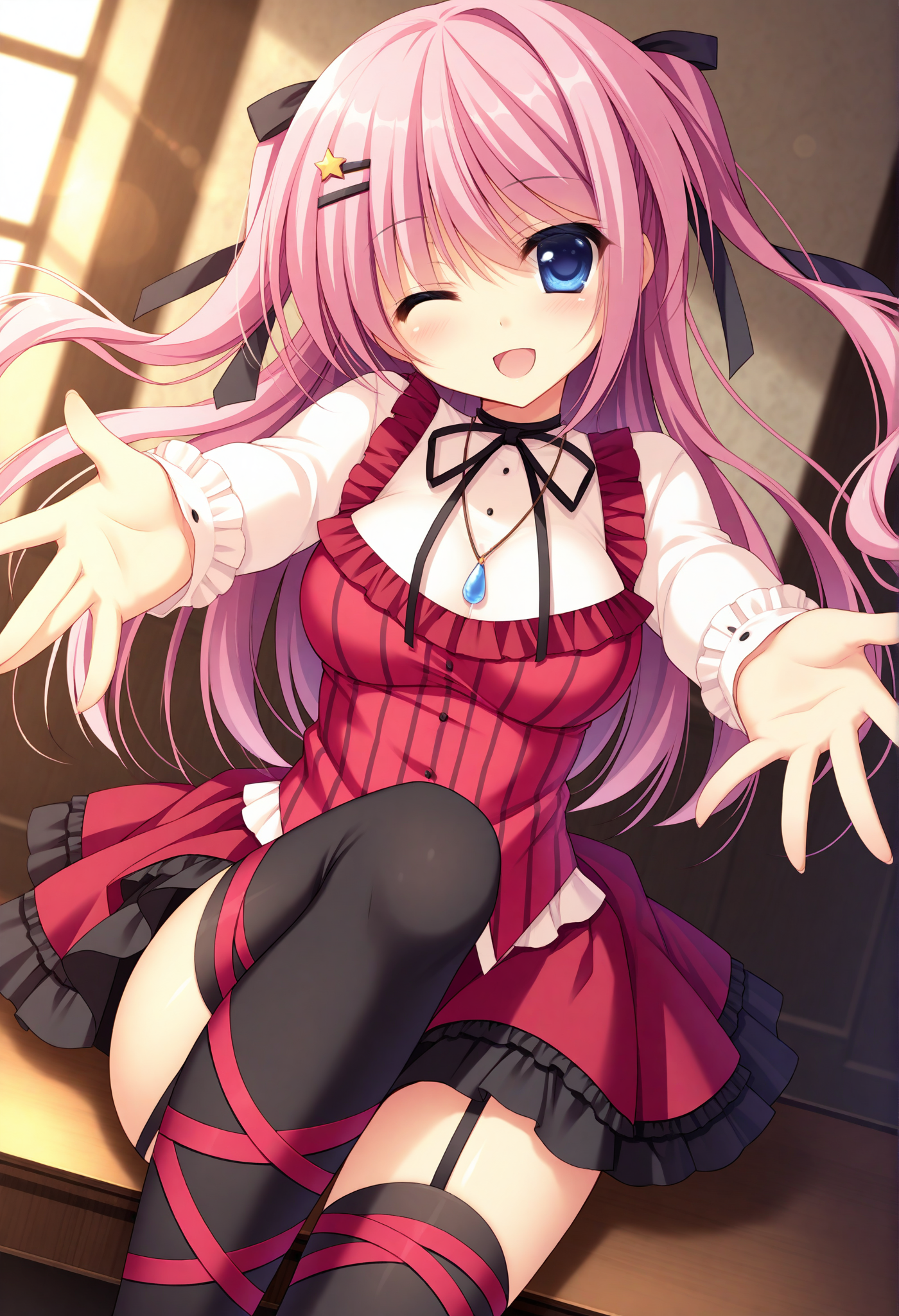 Kanata,pink hair,blue eyes,hairclip,black hair ribbon,star hair ornament,