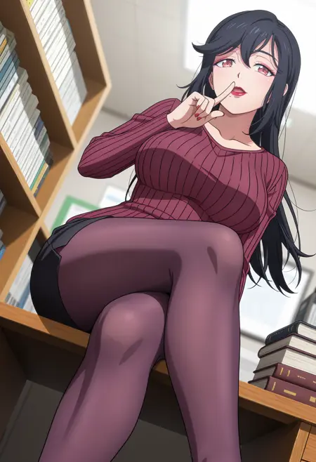 - black skirt, sweater, pencil_dress, purple pantyhose,
