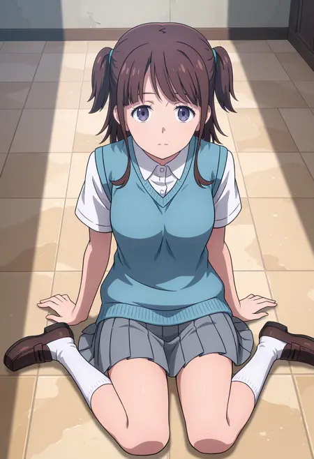 - プリーツスカート、グレーのスカート、白い靴下、ローファー、白いシャツ、青いセーターイージー、