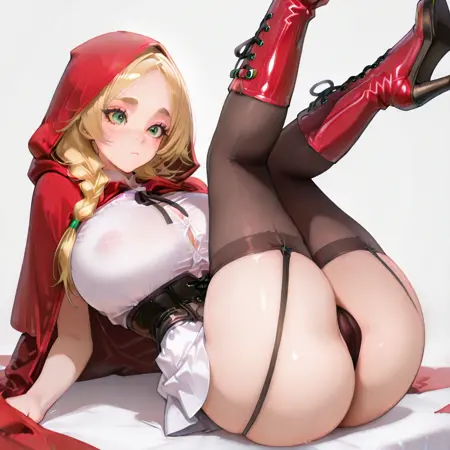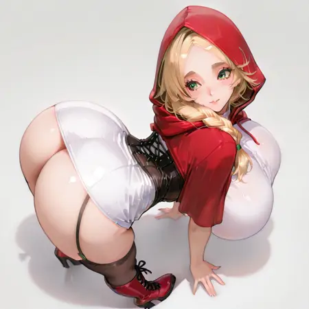 red_hood,hood_up,hooded_cloak,white_shirt,black_corset,white_skirt,miniskirt,black_thighhighs,garter_straps,high_heel_boots,knee_boots,red_footwear,cross-laced_footwear,