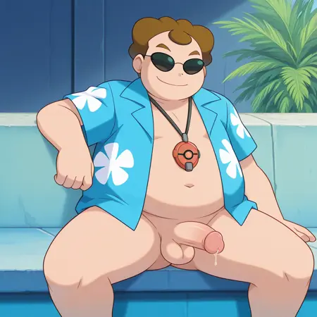 • pokedex_项链, 项链, 蓝色衬衫, 花纹图案, 夏威夷衬衫, 白色短裤, 白色鞋子,