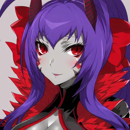 Dark Mai /(blazblue/), gray skin female, purple hair, ponytail, red hair ribbon,