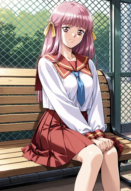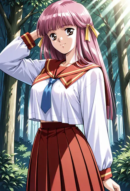 Base: nanpamai, retro artstyle, 1girl, solo, long hair, hair ribbon, blunt bangs, yellow ribbon, pink hair, brown eyes, d1school uniform, serafuku, red sailor collar, necktie, pleated skirt,red skirt, long sleeves,