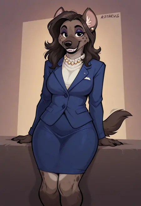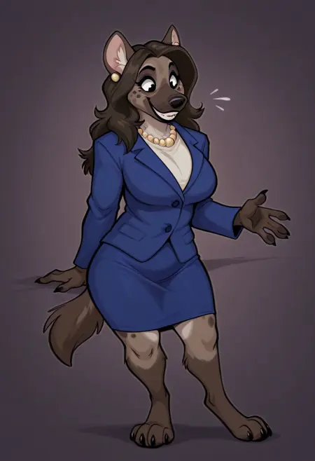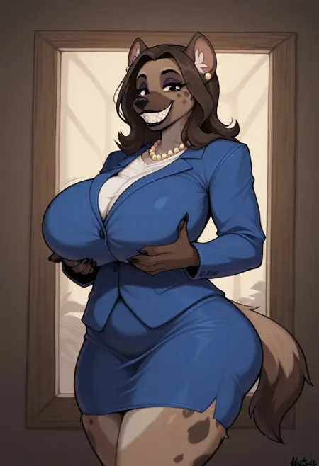 Tag: hyenakamalaILL, black eyes, furry, female furry, anthro, hyena, brown fur, grey body, sharp teeth, dark brown hair, long hair, blue blazer, tight blue skirt, necklace, eyelashes, makeup, animal ears, tail, snout, earrings, suit jacket, dark skin, paws, claws, fangs,