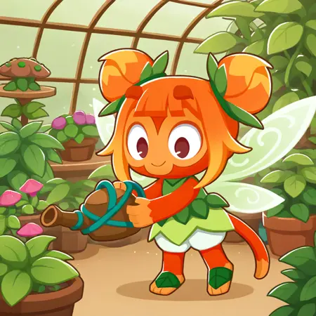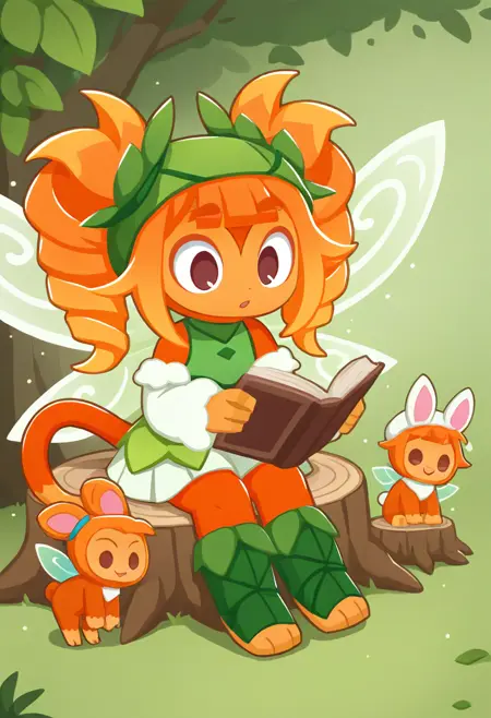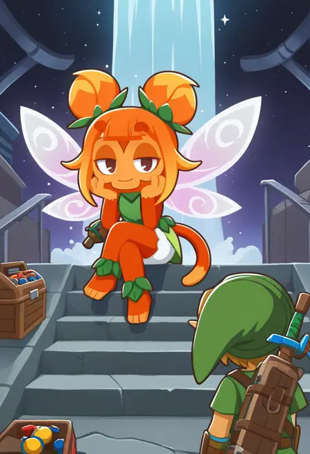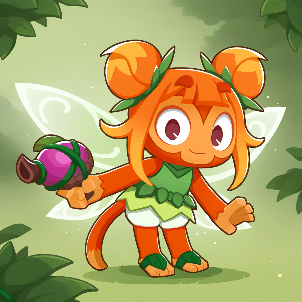 Basic tags: r0sf41, 1girl, monkey girl, orange skin, two-tone skin, orange hair, double bun, brown eyes, fairy wings, tail, leaf clothing, shorts, sleeveless, leaf sandals,