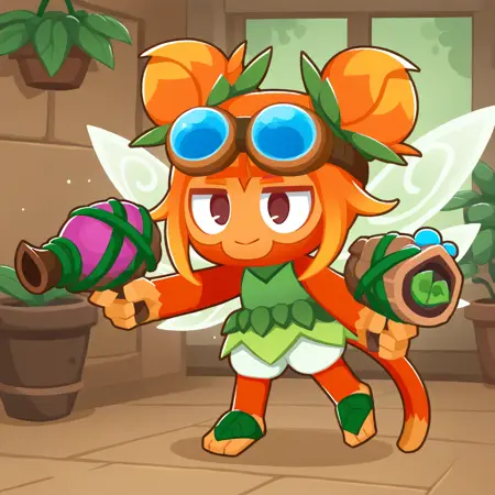 The Tinker Fairy skin for Rosalia, giving the monkey mechanic a magical motif. Missiles and grenades become acorns and her ray gun fires berry seeds. Her missile silo/lab becomes a tree stump.