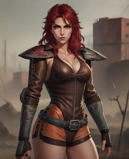shoulder pads, leather leotard, shorts, cleavage, long sleeves, fingerless gauntlets, thigh boots, knee pads, necklace, belt,