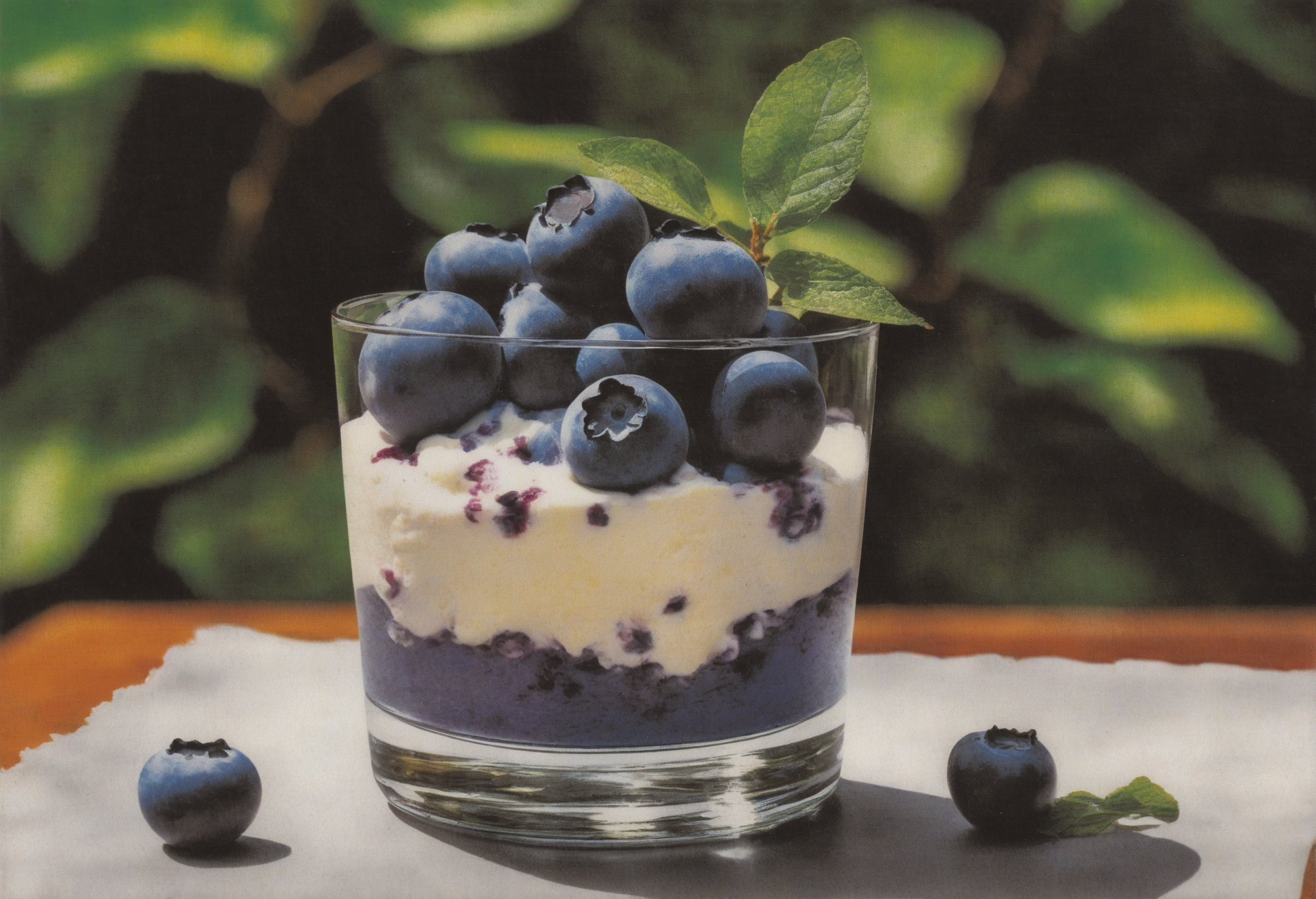 예: shtnspstl, 유리잔에 바닐라 아이스크림 위에 블루베리가 올라간 사진, 배경에 식물
