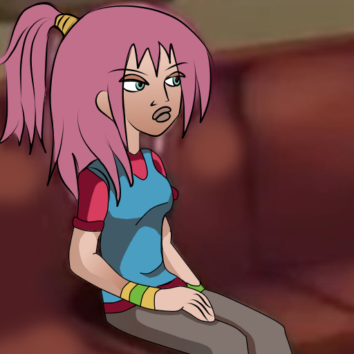 ellie, ellie martin, pink hair with a pony tail and a yellow hair tie