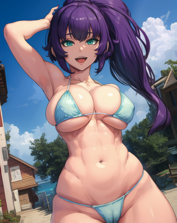 Saaya, purple hair, or black hair, blue eyes, or green eyes, --- ponytail, bangs,