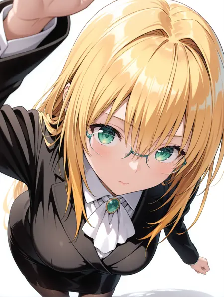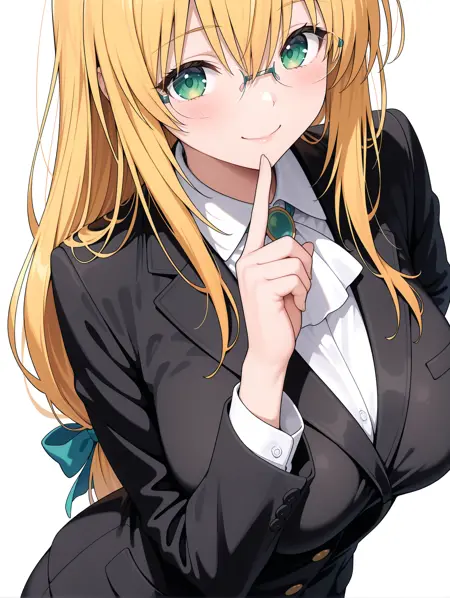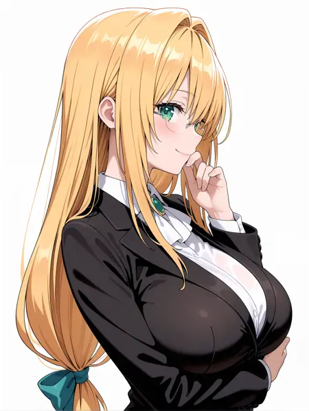 트리거 단어: Tearju, 금발, 녹색 눈, 낮게 묶인 긴 머리, 파란 머리 리본,