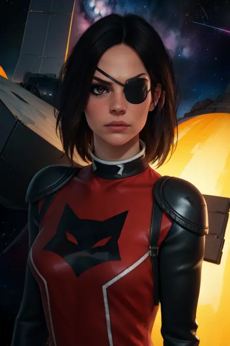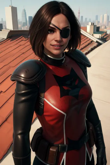 Sarah, 눈가리개, 갈색 눈, 짧은 검은 머리,