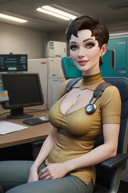 Tannis, short brown hair, green eyes,