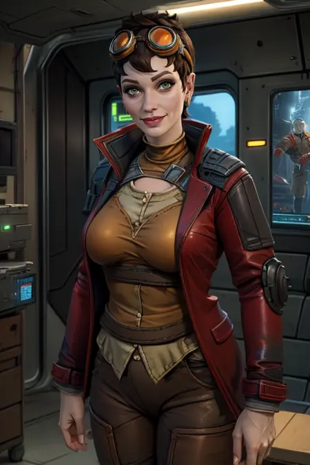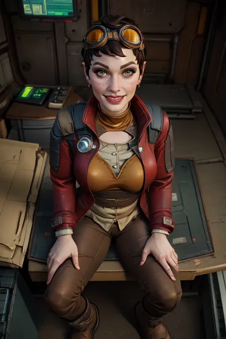 goggles on head, red jacket, tan shirt, fingerless gloves, brown footwear, dark pants,