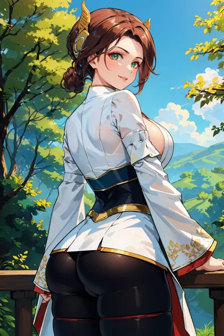 添加 "发饰、白色连衣裙、宽袖、紧身裤、大腿靴" 以呈现她的典型造型。