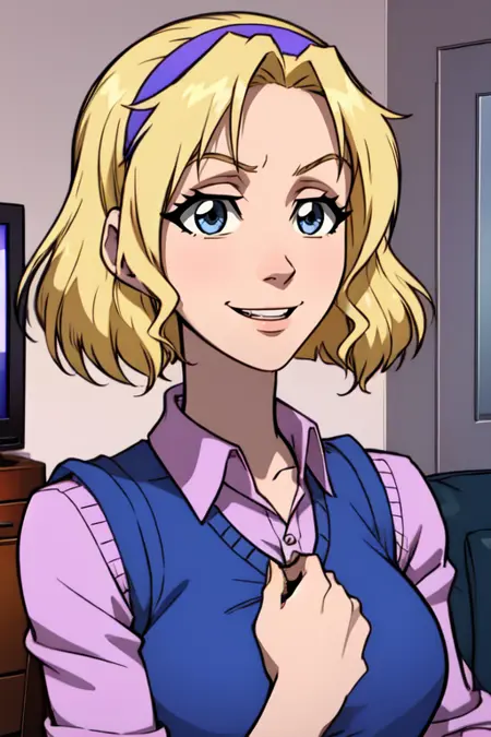 hairband, purple vest sweater, pink shirt, dress skirt, heels,